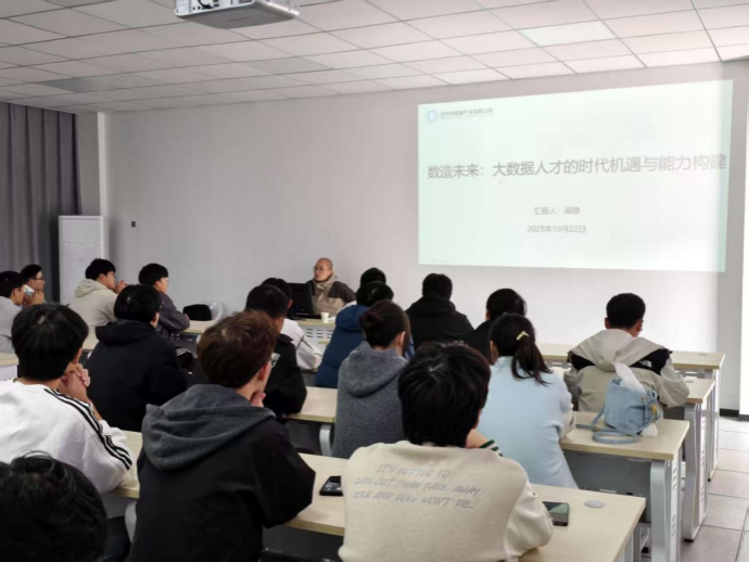 陆克中向同学们介绍了数据产业有限公司总经理吴稳的基本情况。希望同学们认真聆听交流内容,积极进行互动交流活动,了解大数据人才的时代机遇与能力构建,在今后的学习中及时调整,做真正能适应社会需求的大数据应用型复合人才。