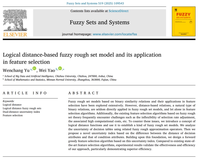 近日,我校大数据与人工智能学院青年教师俞文昌在模糊数学国际权威期刊《Fuzzy Sets and Systems》(中科院一区TOP期刊)上发表了一篇题为“Logical distance-based fuzzy rough set model and its application in feature selection”的学术论文。