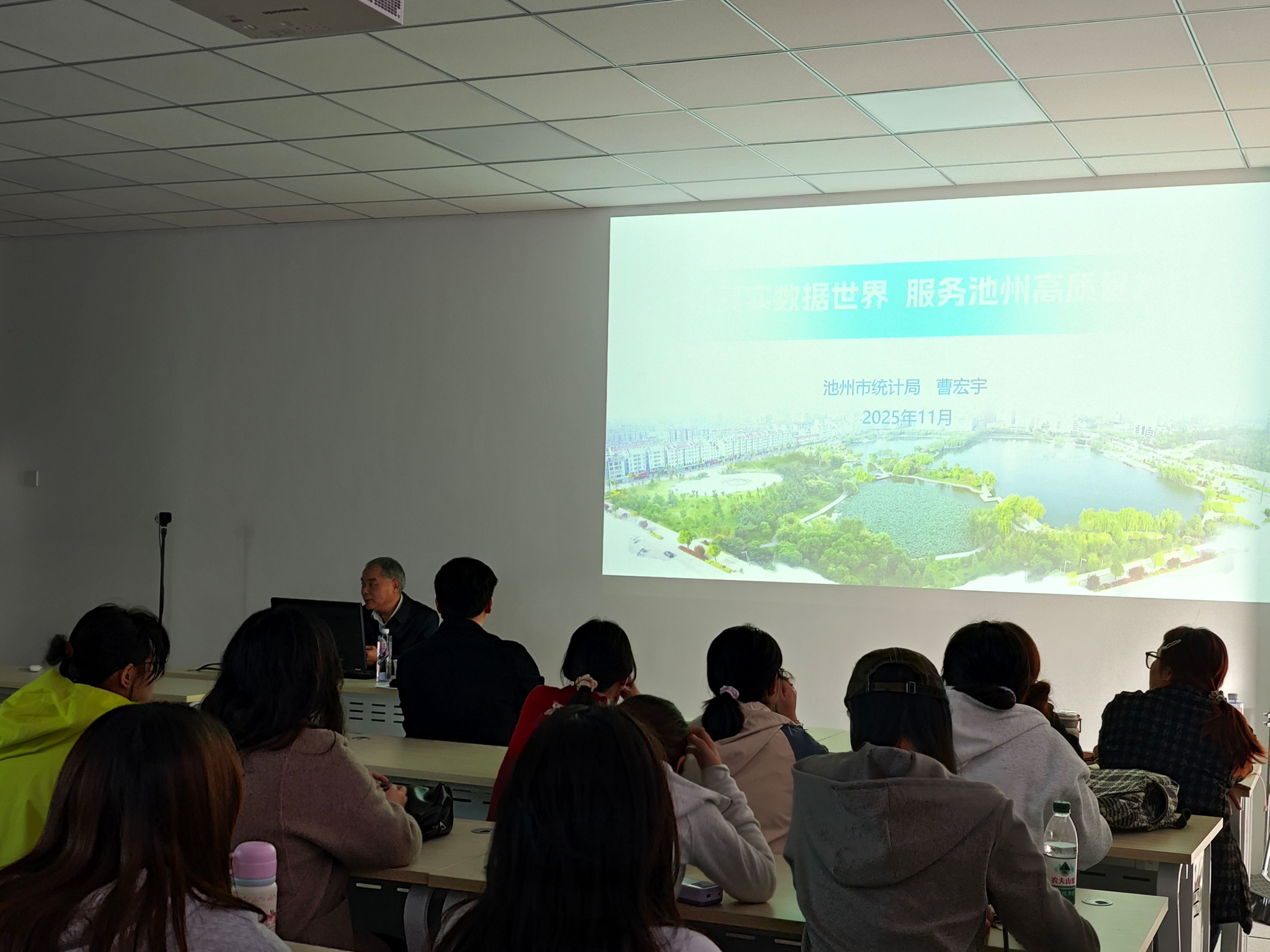 11月13日下午,大数据与人工智能学院特邀学院优秀校友:池州市统计局党组书记、局长曹宏宇,举办了一场题为“走进真实数据世界服务池州高质量发展”的专题讲座。学院副院长吴燚与23级统计学学生参会。