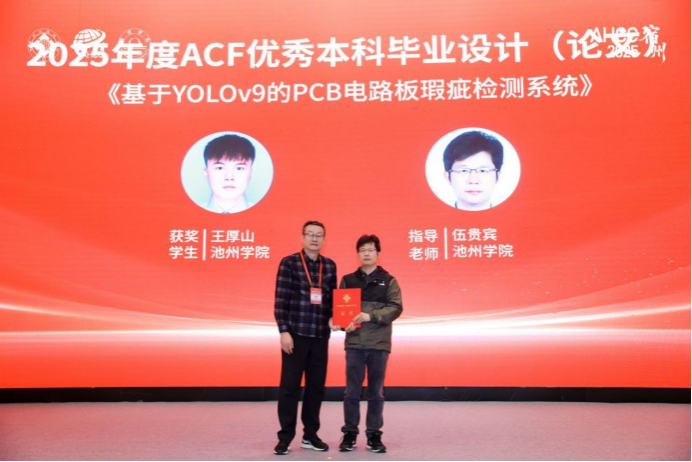 此外,大会还颁发了2025年度“安徽省计算机学会优秀本科毕业设计(论文)”等奖项。学院2019级数据科学与大数据技术专业王厚山同学的毕业论文《基于YOLOv9的PCB电路板瑕疵检测系统》获评为优秀本科毕业论文,指导老师伍贵宾作为代表领取了安徽省计算机学会颁发的证书。