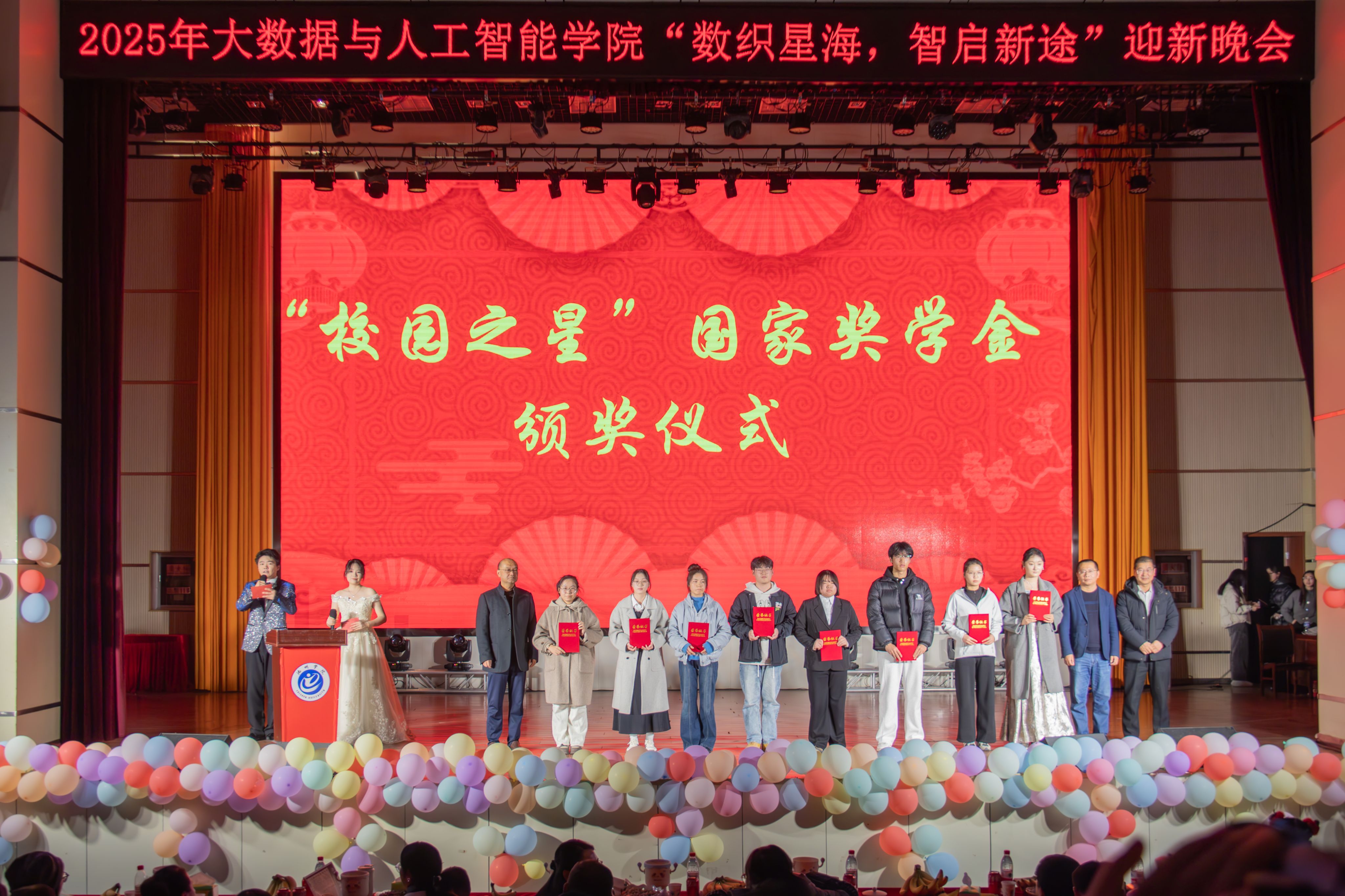 随后,出席晚会的各位领导为“数智之星”“校园之星”“国家奖学金”获得者颁发了荣誉证书。这份荣誉,既是对他们过往努力的高度认可,亦是对全体学子见贤思齐、追求卓越的深切激励。最后晚会在大合唱《明天你好》的优美歌声中落下帷幕。