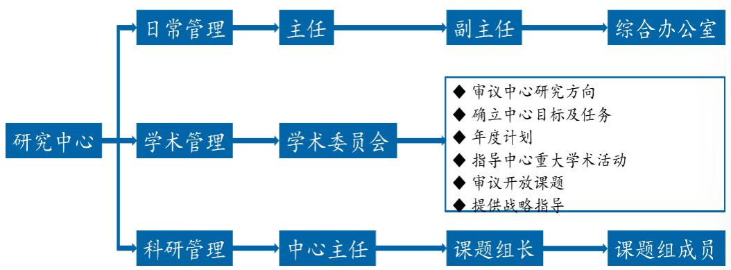 中心实行中心主任负责制。中心设主任 1 名,负责中心的全面工作,副主任 1 名,分管技术研发和行政工作; 设科研助理 1 名,协助主任开展中心管理与协调工作;设 办公室主任 1 名,负责中心日常统一管理,包括各项管理 与工作制度的实施、条件建设、设备设施维修、科研成果、内外联系、学术活动、后勤保障等。